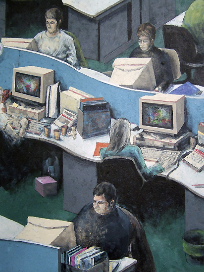 The paintings are fairly large and certainly a massive jump from the source newspaper cuttings. It requires much guesswork and invention to develop the necessarily sketchy visual information. The paintings develop slowly, additively with many revisions and alterations along the way. This is not a comfortable procedure and is the reason that a different methodology is arrived at to resolve each one. There are various intuitive cum quirky elements for example the computer screens in the first painting became a bit like early Kandinskys and the pinboards in the fourth resolved into 'Rothko-esque' compositions