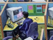 The four Call Centre paintings immediately pre-date the Press Cuttings work but are part of it in all but name. They share the two main characteristics in that they derive from images cut from newspapers and they have an all-over composition without an obvious centre of interest.